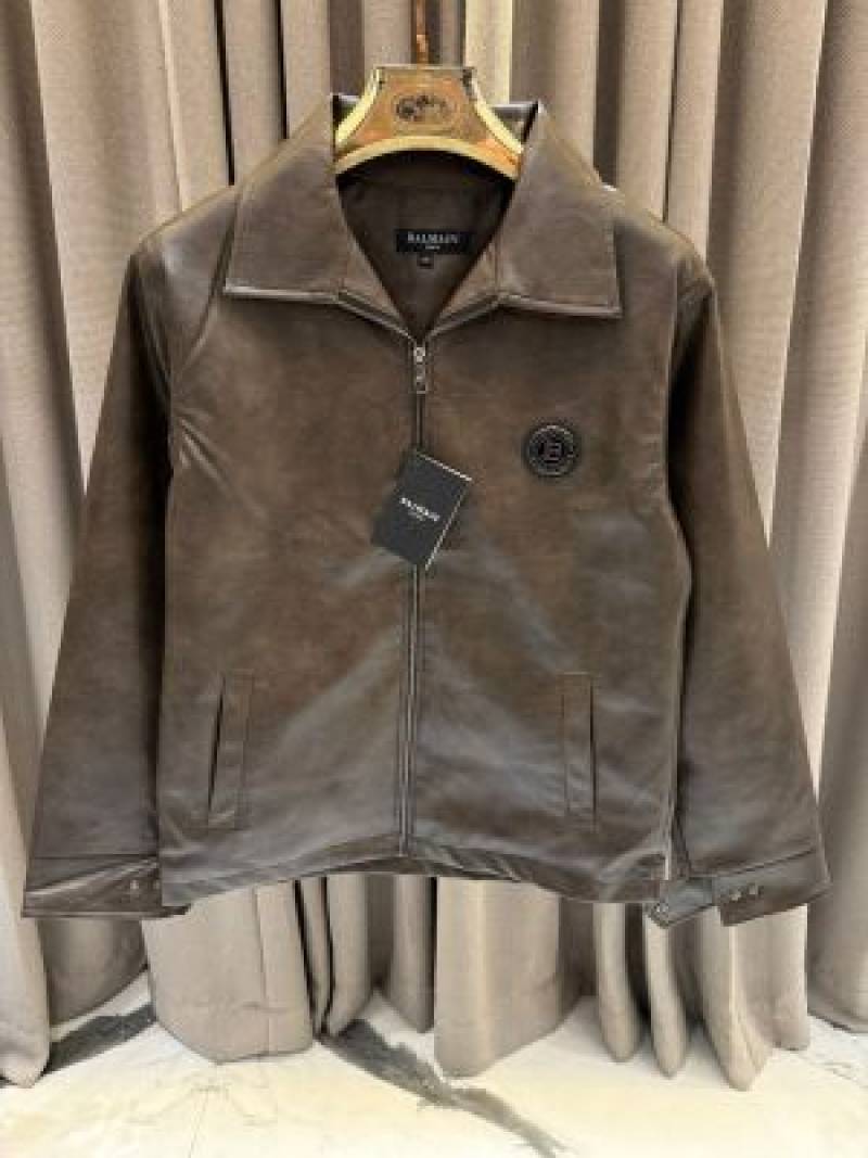 Balmai_n Metal Chest Logo Leather Jacket Imported Dark Brown